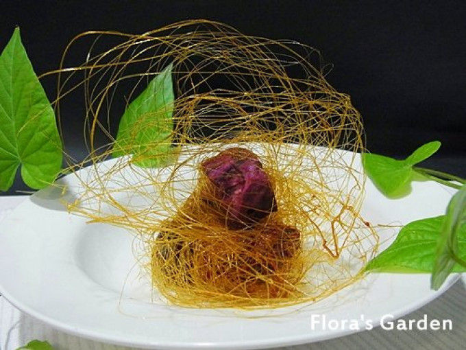 過年快到了, 總喜歡喜氣洋洋^^ 這道金絲地瓜可說是拔絲地瓜進化版-- 讓拔絲變金絲XD