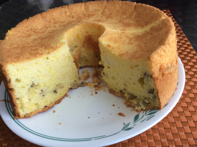 食材 : 加州甜橙(香吉士), 蛋白, 蛋黃, 細砂糖, 細砂糖, 橄欖油, 柳橙汁, 低筋麵粉, 萊姆酒, 香草籽醬, 肉桂粉, 防潮糖粉(裝飾用)