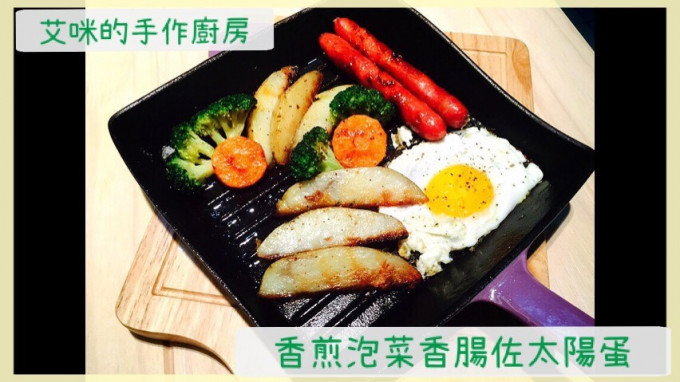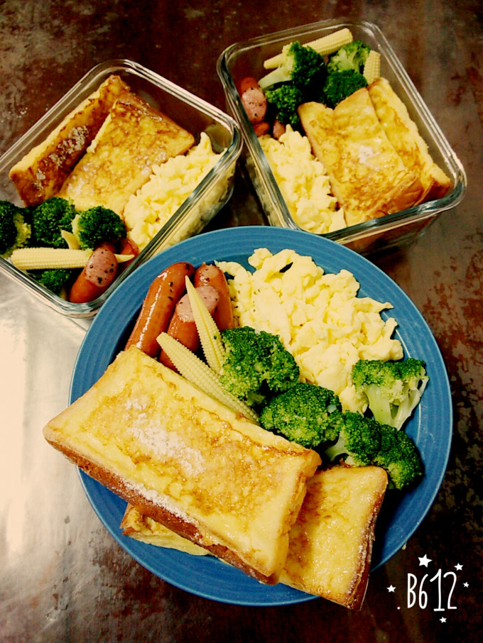 食材 : 厚片土司, 德式香腸, 雞蛋, 花椰菜, 玉米筍, 蒜頭, 橄欖油, 牛油, 鹽巴, 黑胡椒粒, 鮮奶, 糖粉, 楓糖