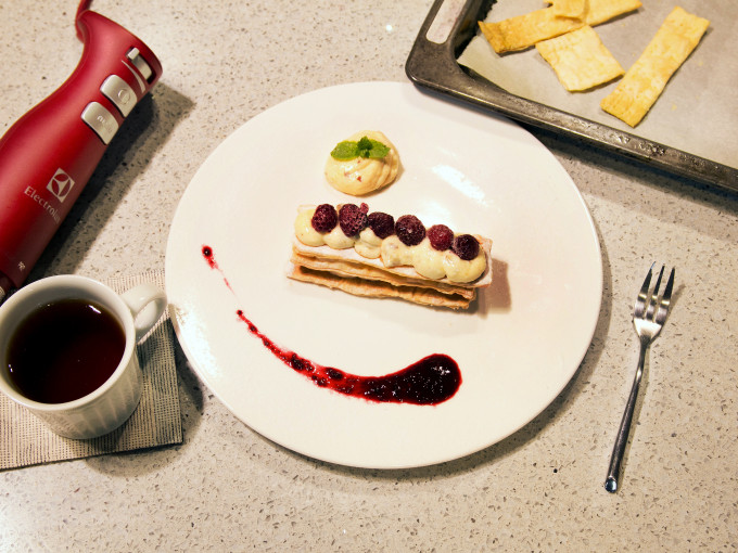 食材 : 酥皮, 覆盆子, 薄荷葉, 糖粉, 蛋黃, 杏仁片(烤至金黃), 牛奶, 鮮奶油, 砂糖, 玉米粉, 君度澄酒