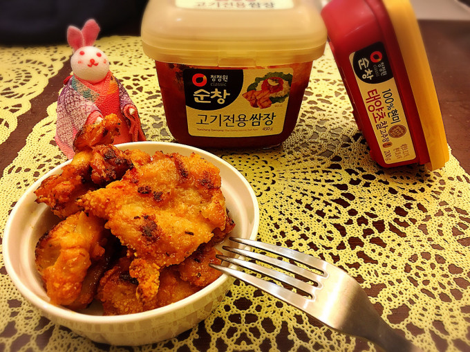 食材 : 去骨雞腿排, 韓式烤肉醬, 韓式辣醬, 義大利紅醬, 蜂蜜, 糖, 蒜粉, 地瓜粉, 鹽