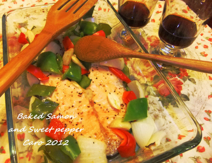 食材 : 鮭魚, 大蒜, 青椒, 紅黃甜椒, 洋蔥, 大蒜粉, 橄欖油, 鹽巴, 義大利綜合香料