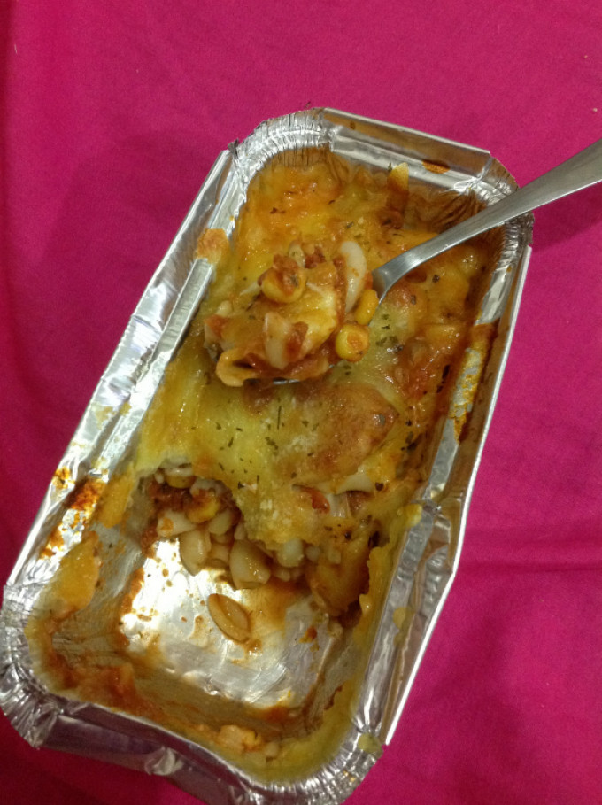 食材 : 通心麵, 非基因改造玉米罐頭, 油漬鮪魚罐頭, 洋蔥, 蒜頭, 杏鮑菇, 牛番茄, Pizza Cheese, 番茄義大利麵醬, 義大利綜合香料, 鹽, 白胡椒粉, 橄欖油或沙拉油