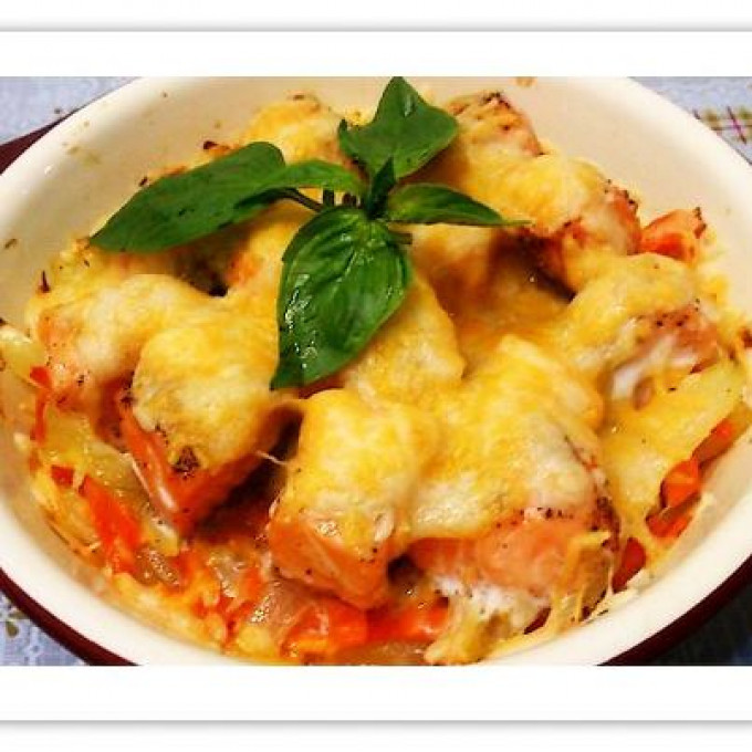食材 : 鮭魚, 洋蔥, 紅蘿蔔, 無鹽奶油, 披蕯用起司, 大蒜、鹽、黑楜椒, 米酒