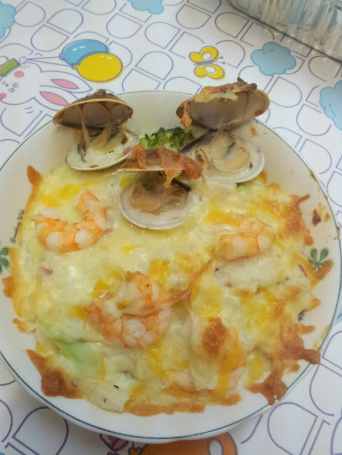 食材 : 火腿(切丁), 白飯, 起司絲(乳酪絲), 奶油, 動物性鮮奶油, 牛奶, 低筋麵粉, 蝦仁和蛤蠣, 綠花椰菜切朵, 秀珍菇, 黑胡椒, 鹽