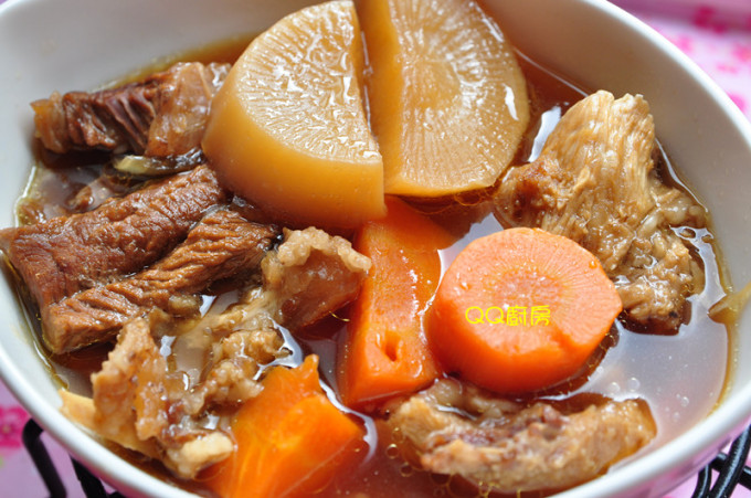 食材 : 牛肋, 牛筋, 洋蔥, 白蘿蔔, 蕃茄, 薑片, 好菇道鴻喜菇, 好菇道雪白菇, 小白菜, 薄鹽醬油, 冰糖, 雞粉, 豆瓣醬, 米酒, 滷包