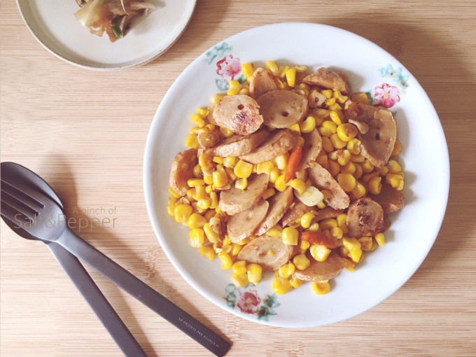 食材 : 罐頭玉米, 黑輪, 辣椒, 蒜, 芝麻油, 塩, 黑胡椒/白胡椒