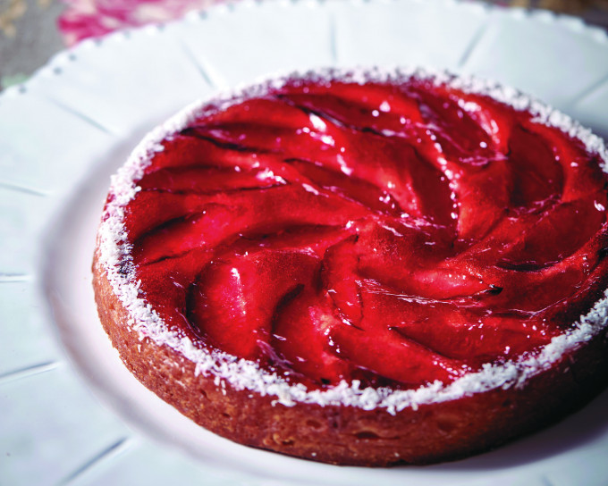 食材 : 紅肉李, 無鹽奶油, 糖粉, 蛋黃, 香草精, 低筋麵粉, 無鹽奶油(打至乳霜狀), 砂糖, 全蛋, 杏仁粉, 蘭姆酒, 肉桂粉, 覆盆子果醬(過篩), 細椰子絲, 防潮糖粉
