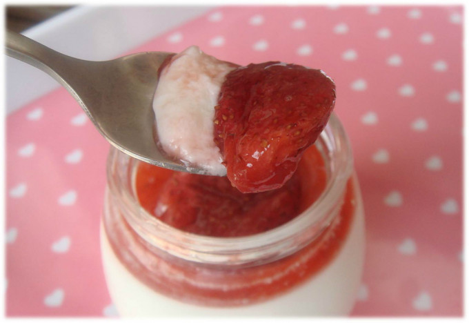 食材 : 蛋, 吉利丁片, 鷹牌煉奶, 草莓, 草莓丁, 草莓牛奶, 細砂糖