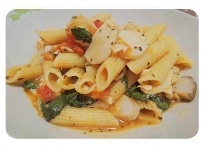 食材 : 牛番茄, 杏鮑菇(大型), 鯛魚片, 斜管麵, 九層塔, 蒜頭, 橄欖油, 鹽巴, 義大利綜合香料, 白酒, 番茄醬, 白胡椒粉