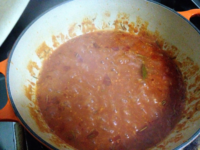 食材 : 蒜頭, 洋蔥, 橄欖油, 蕃茄糊, 新鮮牛蕃茄, 塩, 胡椒, 月桂葉, 乾百里香, 乾迷迭香