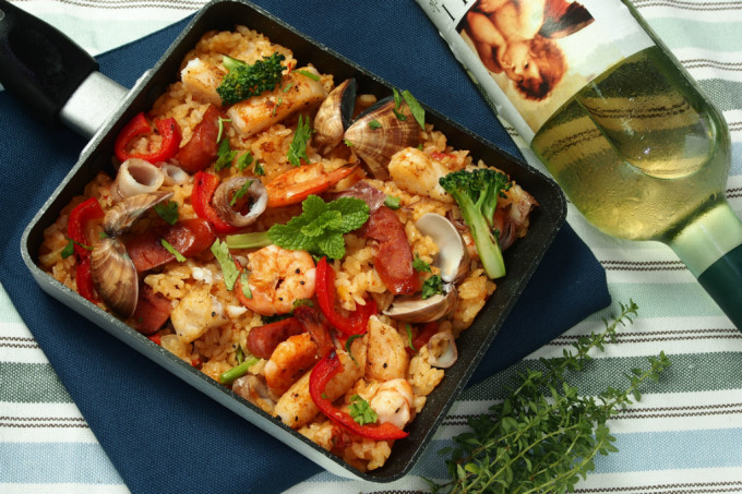 食材 : 米, 鱈斑魚, 蝦子, 小卷, 蛤蠣, 花椰菜, 番茄, 紅甜椒, 番紅花, 檸檬, 香菜, 新東陽德式香腸紐奧良辣味, 洋蔥, 西班牙紅椒粉, 蒜頭, 白酒