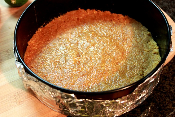 做,先把奶油用微波爐融化,加入敲碎的消化餅乾屑!