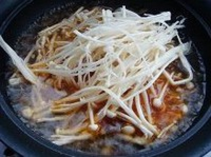 煮開後加入肥牛片,用筷子快速翻動,讓肥牛在湯中散開,當肥牛片變色後關火,盛出,散上蔥花即可。
