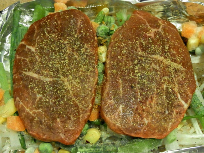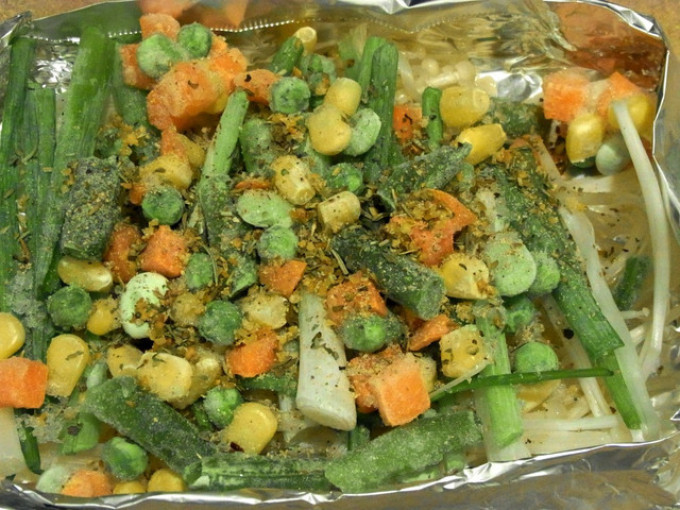 每舖一些蔬菜就灑點香料粉和橄欖油。