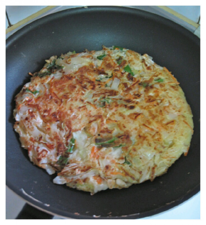 開中大火熱鍋加1大匙麻油,加入蔬菜麵糊並平壓麵糊。