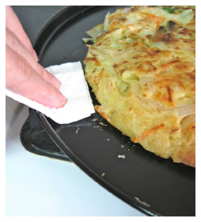 若喜歡乾爽口感,起鍋後用『五月花妙用廚房紙巾』幫助煎餅吸去多餘油份。