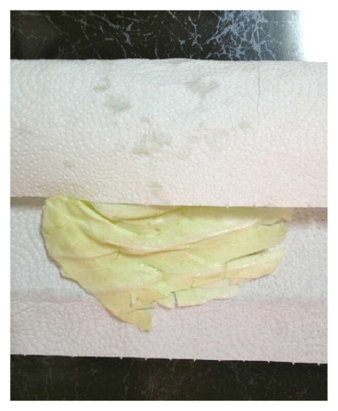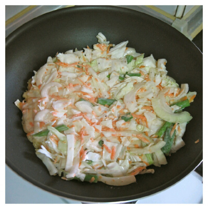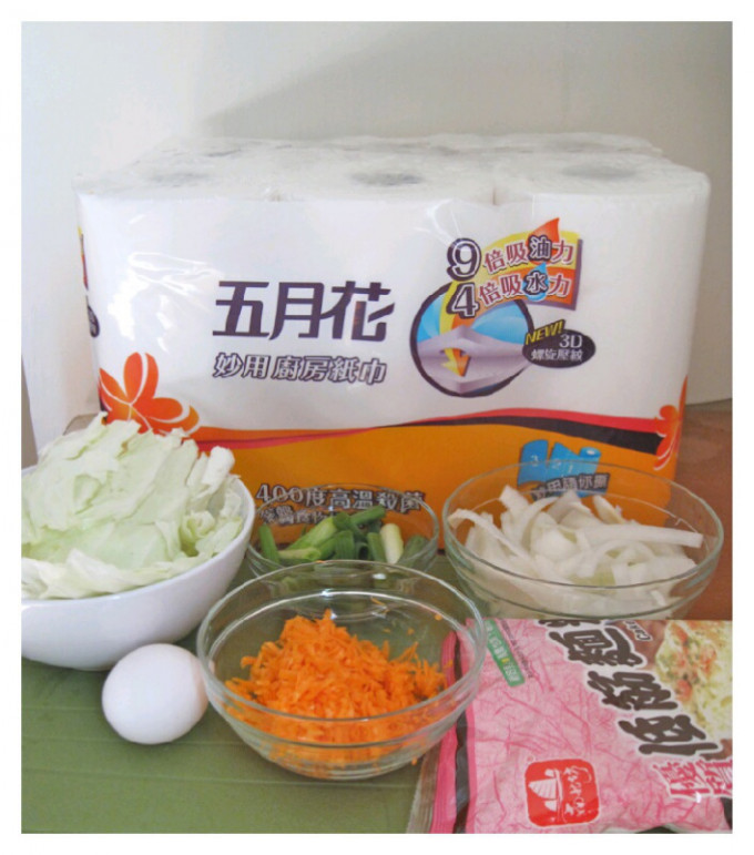 洗淨高麗菜並切成小塊(或條狀),洋蔥切絲,紅蘿蔔刨成細條狀,利用『五月花妙用廚房紙巾』擦拭高麗菜葉上的殘留水份,因為等一下加入麵糊後蔬菜會持續出水,為能夠精準抓住麵糊黏稠度,要盡量吸乾蔬菜的水份喲~