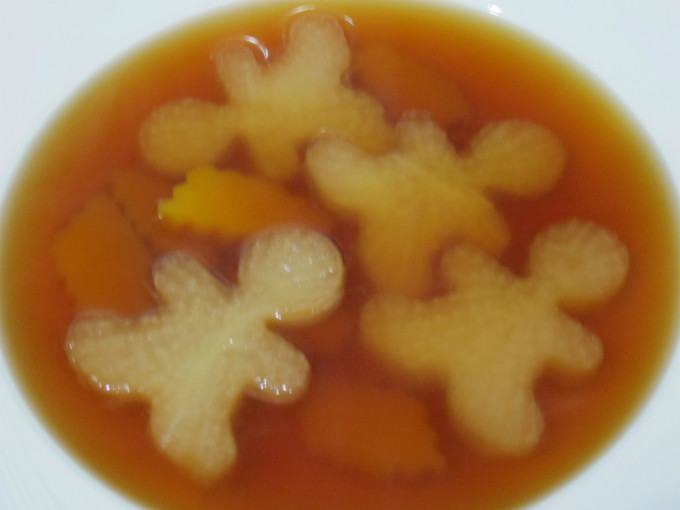 一鍋水,加入醬油一匙調出醬色,將蘿蔔類需上色蔬菜放入煮熟,並以鹽巴調味。