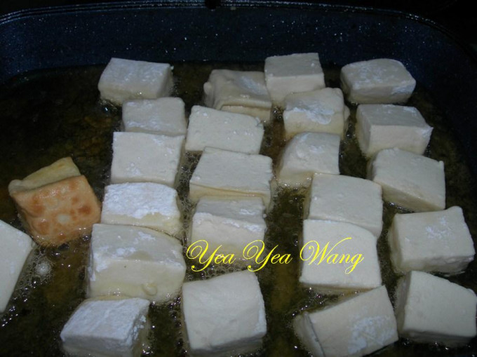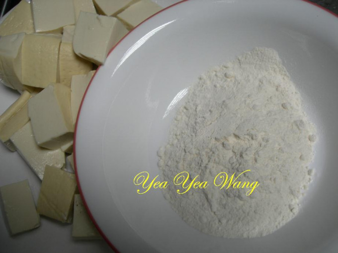 將豆腐裹上麵粉入油鍋炸至金黃