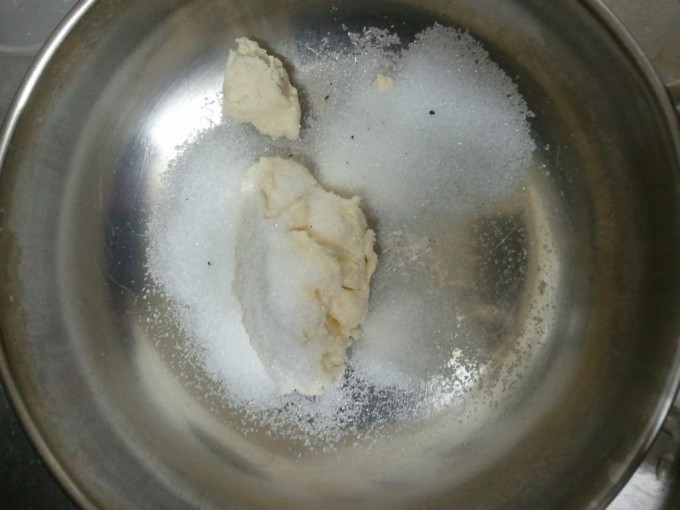 奶油乳酪.和細砂糖.用打蛋器打至泛白