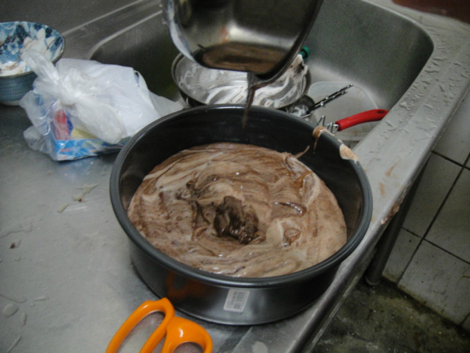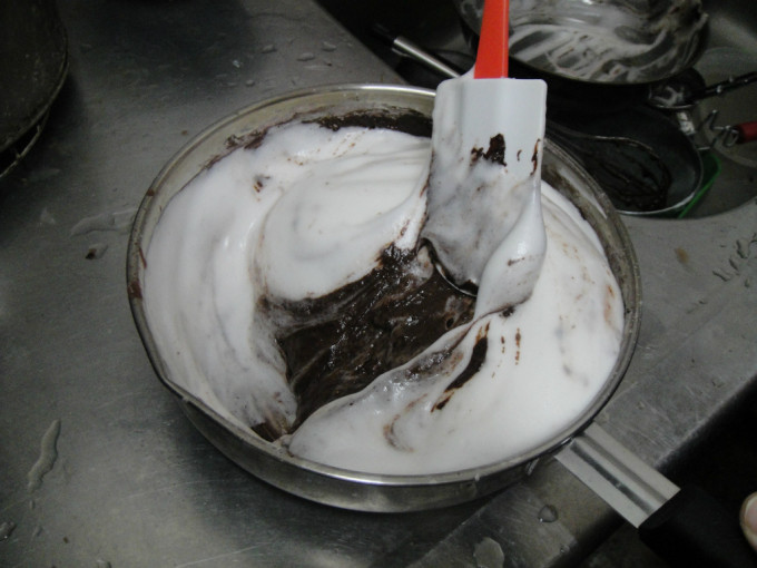 軟式巧克力醬.沙拉油.鮮奶.加入1.攪拌均勻.再加入蛋黃