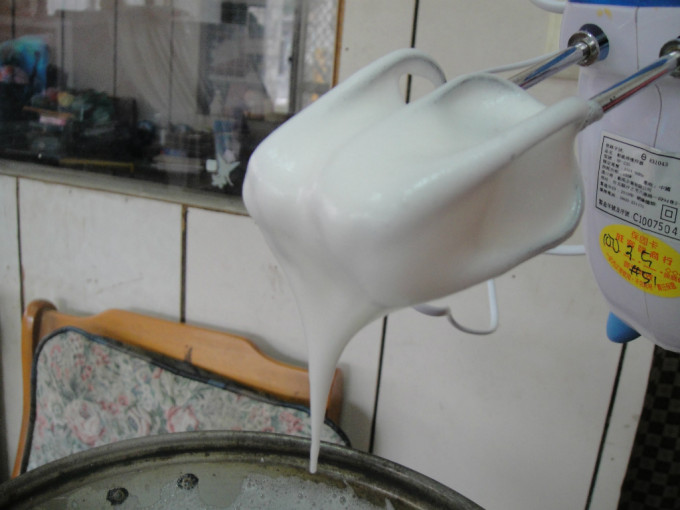 蛋白霜打發.先將蛋白加入檸檬汁.打至泛白再分兩次加入糖打至不滴狀
