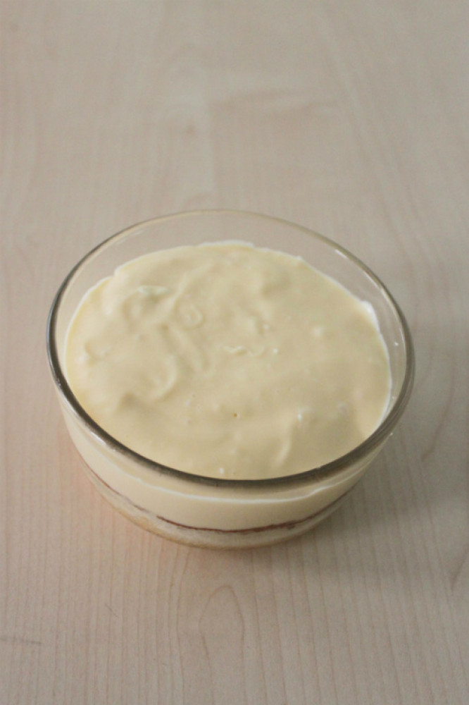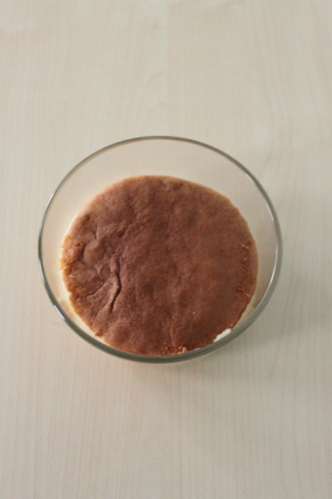 將切成適當大小的海綿蛋糕(我買711的蜜雪蛋糕)放置容器中間稍壓一下,將3倒進去後放冰箱冷藏1小時後,拿出灑上黃豆粉稍稍裝飾即可。