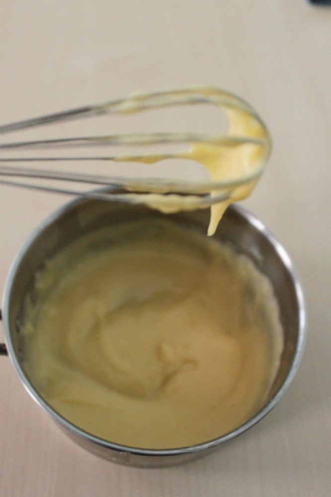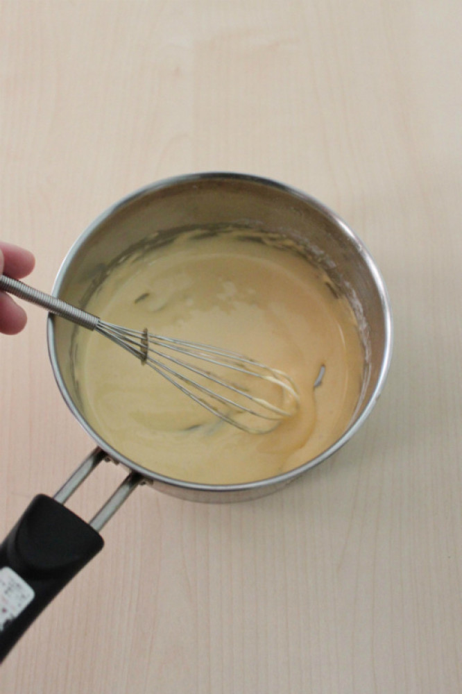 將奶油乳酪放進盆裡先攪拌滑順,分幾次慢慢加入2繼續攪拌均勻。