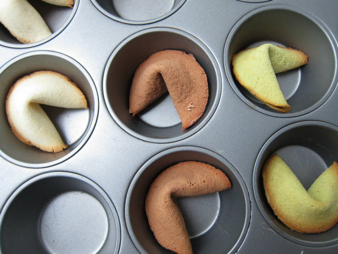 馬上取出.趁熱將籤語放置在圓餅中間並對折.拿一個馬克杯將對半的籤語餅放在杯緣,向下凹,成型 (此步驟要快,避免餅乾冷掉後便硬不易塑型)