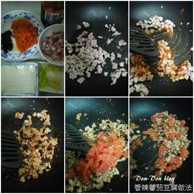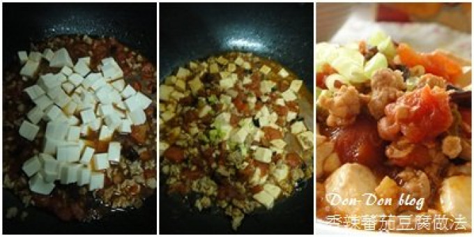 這回嚐試將蕃茄跟著豆瓣結合,炒上絞肉和豆腐,就有點像是麻婆豆腐加上蕃茄,