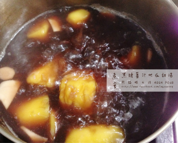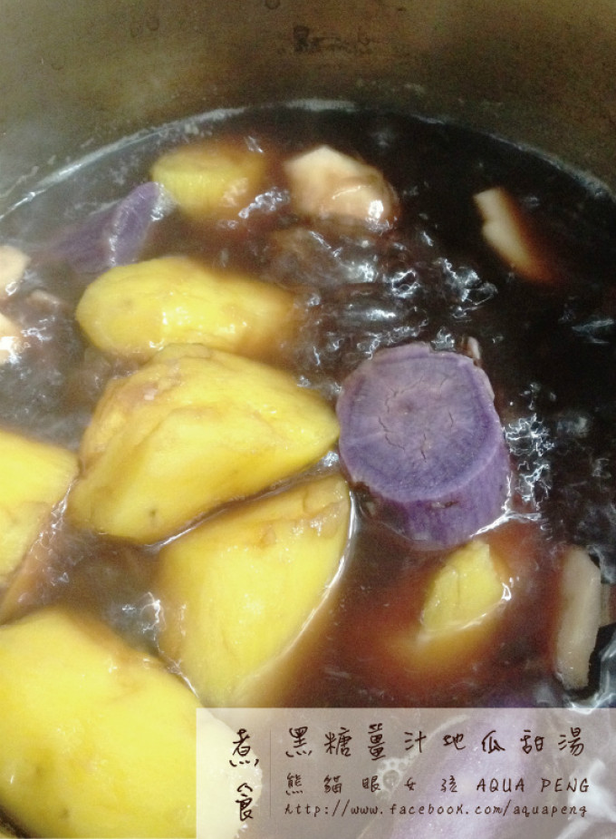 將處理好切塊的地瓜,放入滾沸的水中。此時加入黑糖塊,薑片。