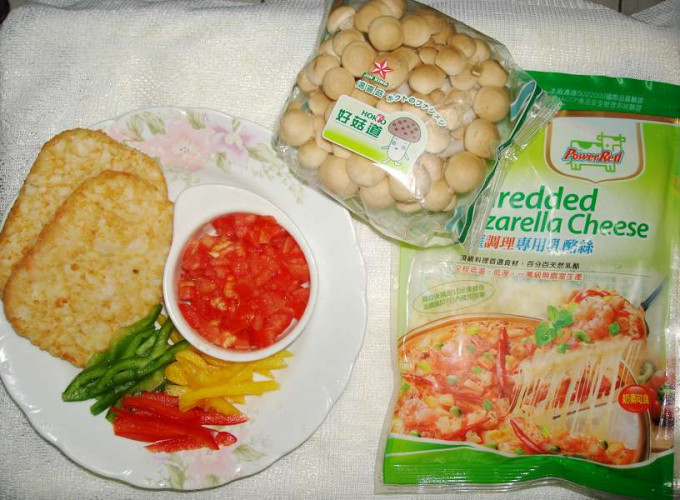 美味的早點,可以來點不一樣的食材,把小朋友最愛的薯餅加上紅、綠、黃椒,再搭配鴻喜菇來焗烤,,要吃的時候再加點蕃茄丁,真是好美味呀...