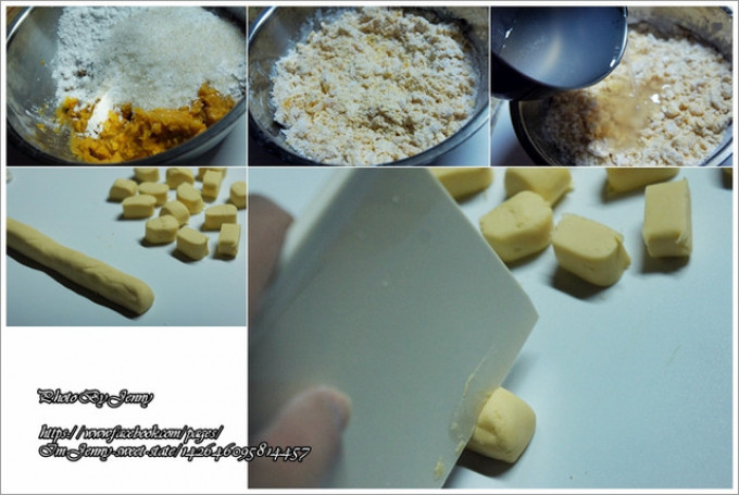地瓜泥與材料b先行混合再加入太白粉芡,揉勻成長條狀,再切成1.5公分小段即成地瓜圓。