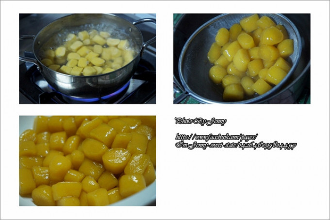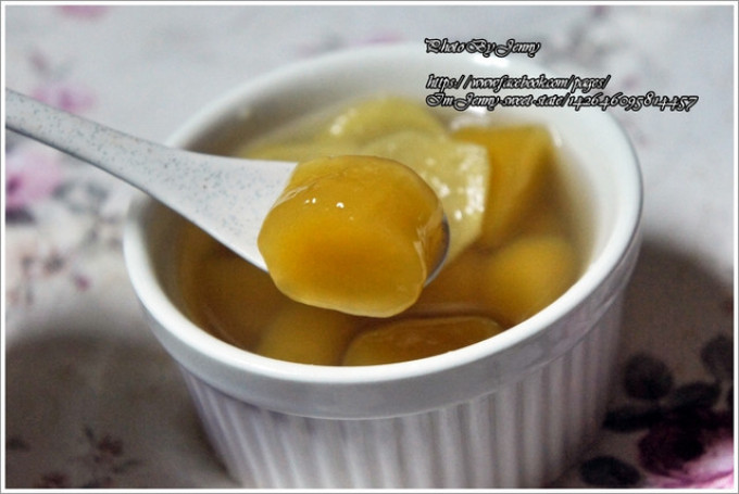 材料c入鍋煮成薑汁糖水,再加入熟地瓜圓即可。