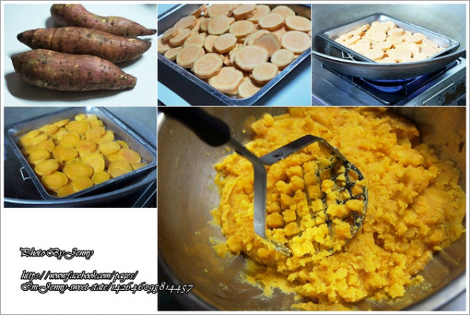 取出蒸熟的地瓜,待略冷卻壓成泥狀。
