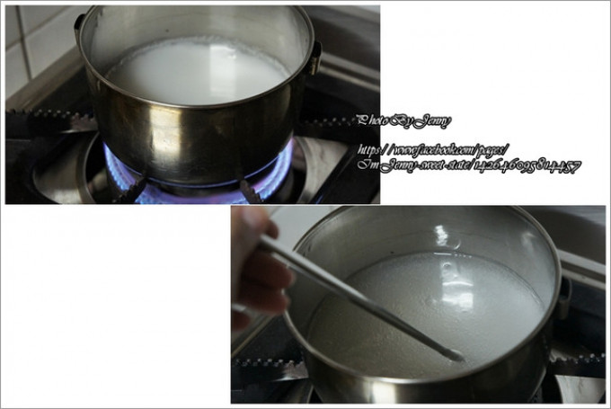 225c.c水入鍋煮沸,將材料a調勻再倒入鍋中,煮成濃稠的太白粉芡後熄火冷卻。