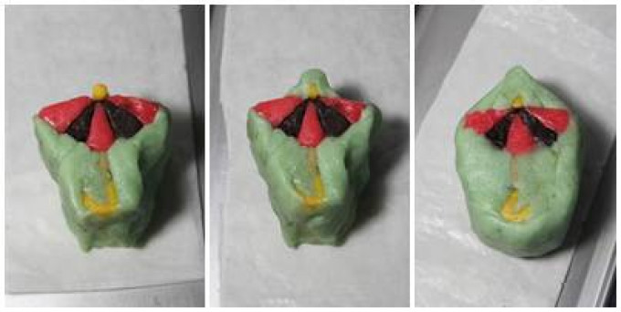 做法如圖1~7捏製(製作途中如麵糰太軟無法捏製,可放置冰箱一些時間再取出,會比較好製作喔!)