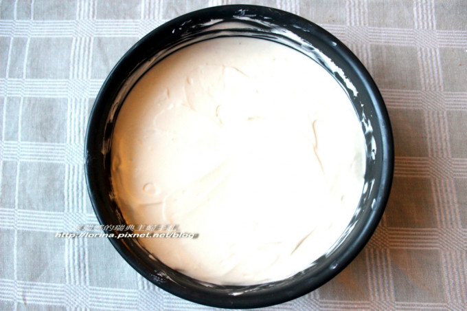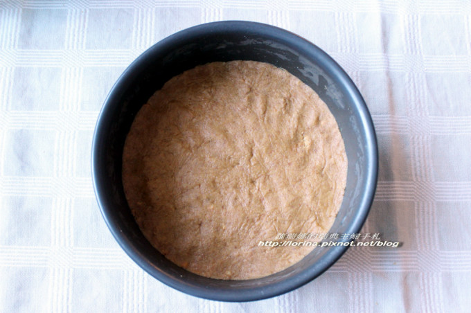 將消化餅乾用桿糆棍碾碎後,加入軟化的無鹽奶油抓勻,接著鋪在八吋的活動蛋糕模底,壓實成厚度一致的餅乾底,接著放入冰箱備用
