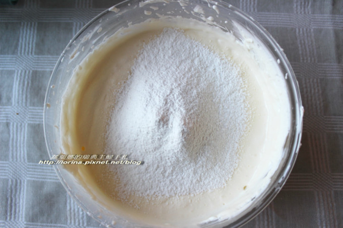 將蛋打散成蛋液,分四到五次慢慢加入起司糊中,每一次都要攪拌到蛋液全部混合均勻後才能在加入下一次蛋液