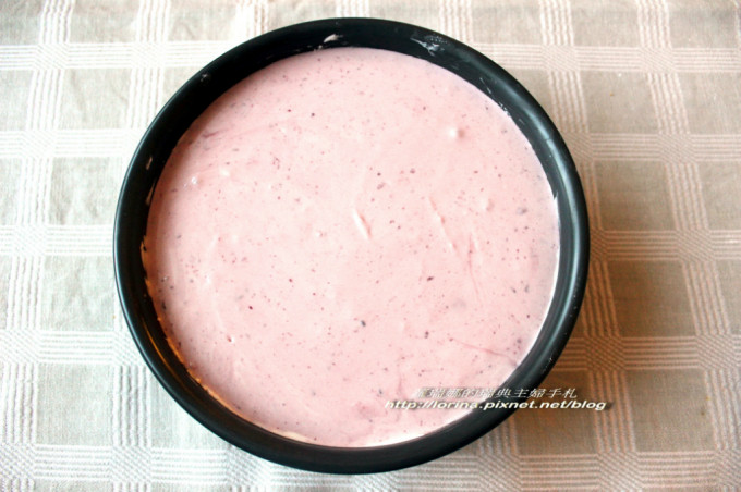 將步驟四的起司麵糊取出450克,加入100克的藍莓果醬攪拌均勻。接著把剩下的起司麵糊跟檸檬汁攪拌均勻。