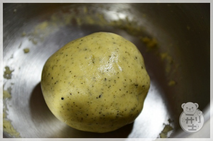 先加入一半已過篩的麵粉攪拌均勻,再倒入另一半的麵粉用手拌勻成麵團