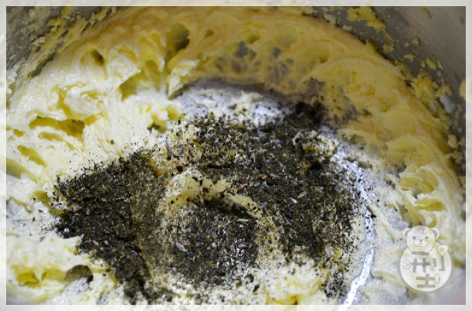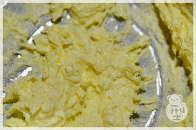 將砂糖、糖粉與奶油(已於室溫軟化)用攪拌器打發呈現乳白色(顏色較原本奶油淡)