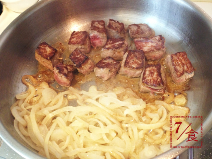 肉塊翻面時,把從微波爐裡拿出來的洋蔥,放進鍋子下方空位炒。肉塊翻面後再煎約2分半。