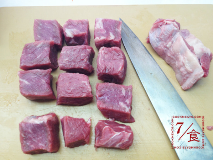 牛排肉,切掉邊邊的肥肉後,切成1.5公分見方的骰子狀大小,撒上鹽巴和黑胡椒,準備下鍋。