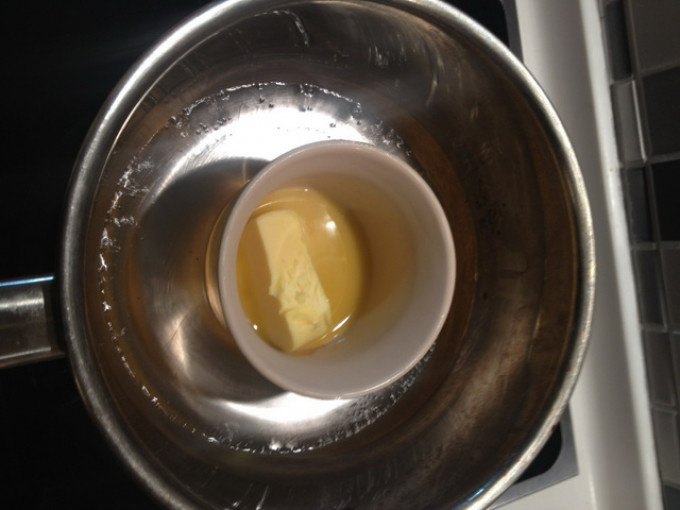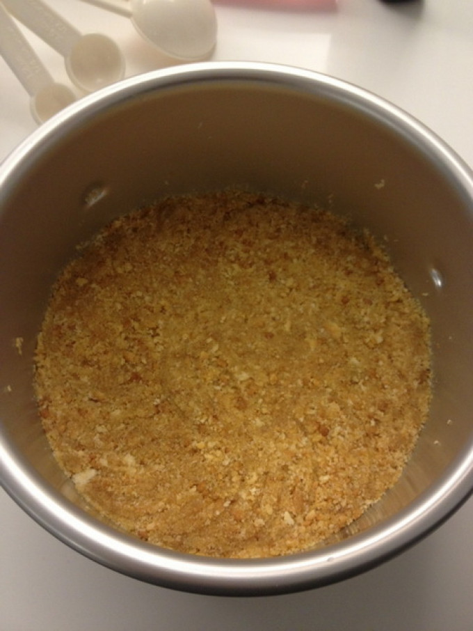 將融化的無鹽奶油加入餅乾碎中仔細混合均勻