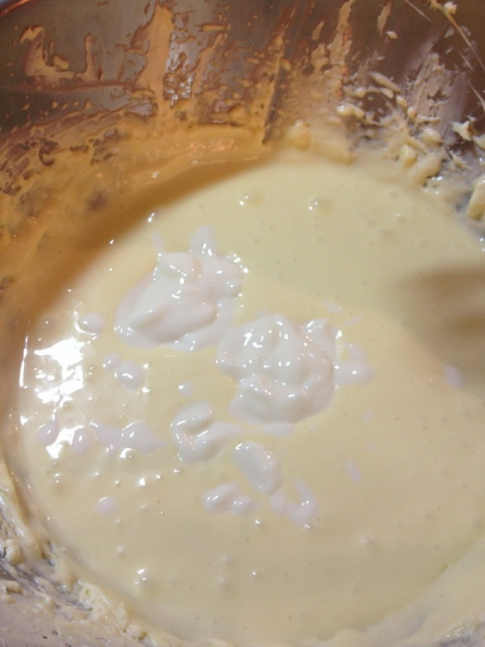依序將細砂糖,雞蛋(1顆一顆加),低筋麵粉,檸檬皮,酸奶油,香草精加入攪拌均勻成為一個細緻的乳酪麵糊(每一次一定都要攪拌均勻才加下一樣)