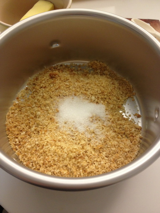 奇福餅乾裝在厚的塑膠袋中,用橄麵棍來回滾壓,壓的越碎越好,再加入細砂糖混合均勻
