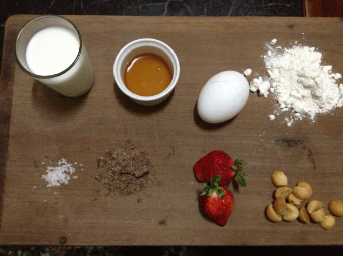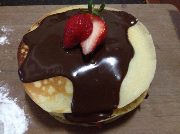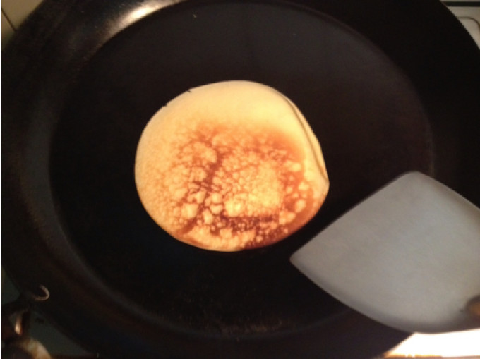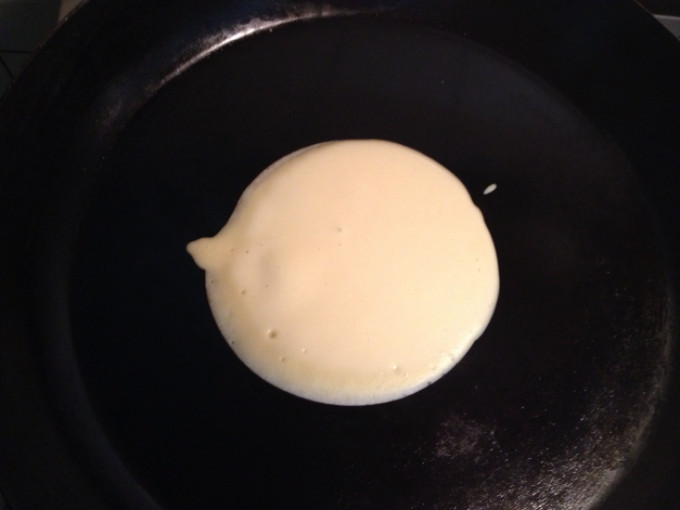 取一平底鍋擦上奶油,倒入一湯匙的麵糊。