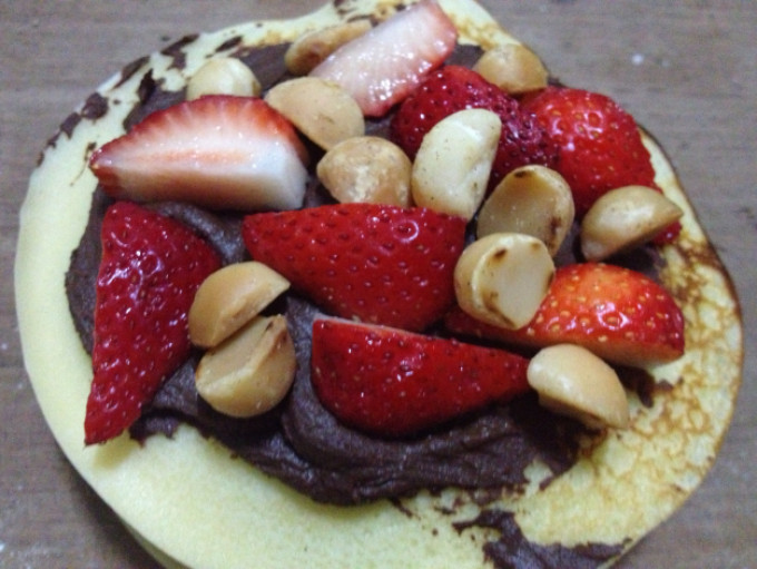 待涼後組合,一層薄絣塗上巧克力餡、草莓切塊、適量堅果。